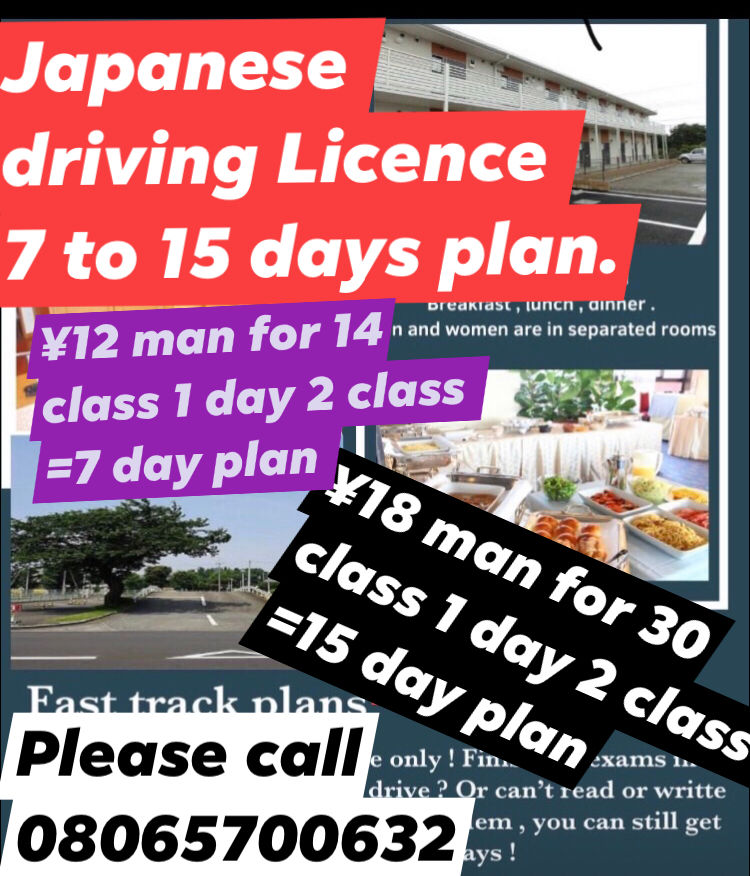 ❗️Dont miss the chance ❗️🤩🤩VIP PLAN 🤩🤩 fast track plan ¥380,000 ~ get your driver's license in 2 weeks🔰🈵 STAY IN COURSE 🈵➡️🎊Automatic and manual transmission fast track plan 🎊 [ AT / MT ]➡️It includes 2 weeks accommodation with all meals included ( BREAKFAST , LUNCH , DINNER , in the school cafeteria)➡️FULL ASSISTANCE 🤝➡️ ROOM ACCOMMODATIONS men and women in separate residences 🙆♀️🙆 ➡️ you don't know how to drive❓don't worry in 2 weeks you get your driving license ❗️➡️ No need to read and write Japanese ➡️ don't worry about the exam❗️ the writing test is in English ! examinations all in one take only ❗️⚠️ For customers who want this plan, call quickly it is by appointment⚠️❗️ What are you waiting for ? Get your driving license in two weeks without complications ❗️⚠️our school all time full.if you admission today so you have to wait 2 or 3 months starting your class.